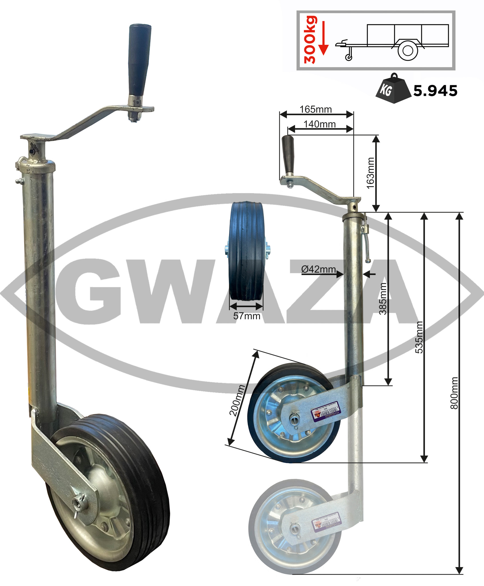 Mit Federklemme - ohne Halterung. Tragfähigkeit = 300kg. Radgröße = 57mm x 200mm Durchm. 600mm von der Unterseite des Rades bis zur Oberseite des Rohres, geschlossene Höhe. Ersatzrad = 5211. Höhe O/A Geschlossen 710mm, offen 990mm.